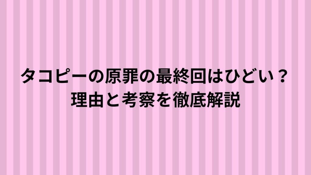 『タコピーの原罪』の最終回を読み終え、「なんだか苦しい」「これはひどい」と感じた方も多いのではないでしょうか。タコピーの自己犠牲によって訪れた結末は、一部で最終回はハッピーエンドだという感想も見られますが、多くの読者に救いがないという印...